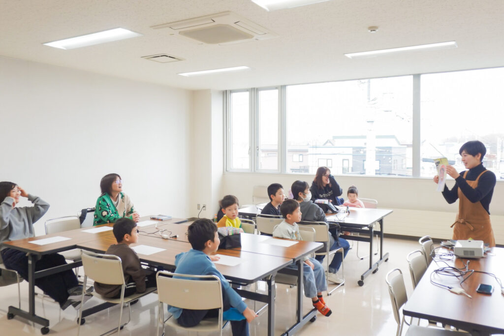 講座は、講師の黒蕨さんが活動拠点とする嵐山の魅力紹介から始まりました。「嵐山にはぜひ行ってみてください。旭川市を一望できるし、動物がたくさんいて自然が豊かなんです」と語る黒蕨さん。エゾリスやシマエナガなど、そこに住む動植物たちの興味深いお話に、子どもたちは目を輝かせます。