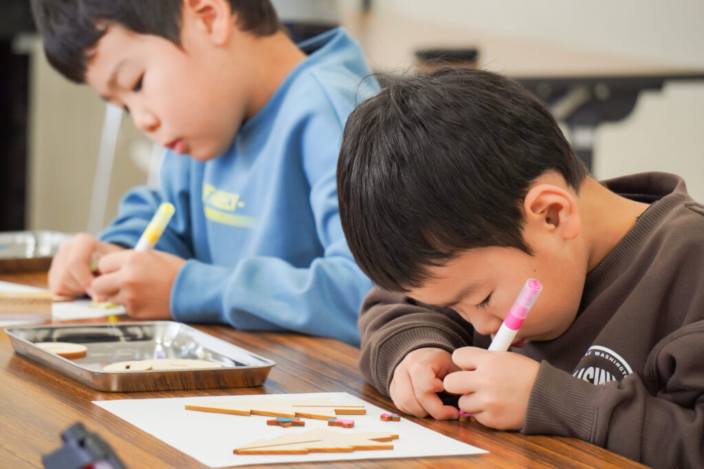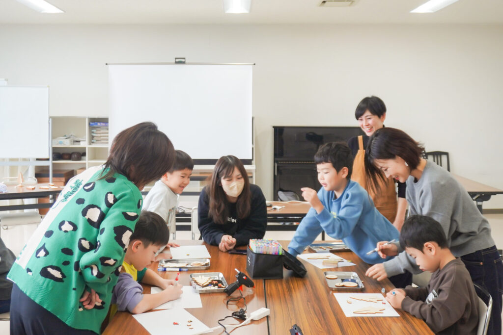 色とりどりのマーカーと繊細なパーツを前に、子どもたちの目が輝きます。大人たちが見守る中、小さなアーティストたちは、まるで宝物を選ぶかのように「どの飾りにしようかな」「この色とこの色、どっちがいいかな」と真剣な表情で吟味。会場は、これから始まる創作への期待感で満たされます。