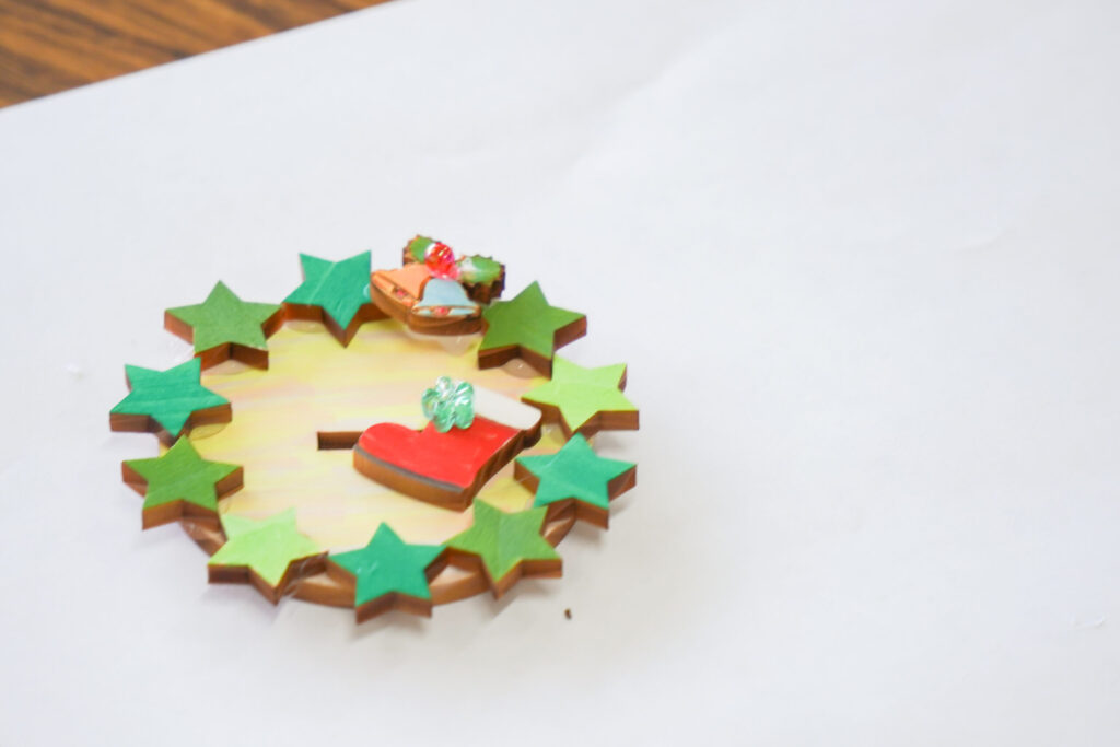 いよいよツリーづくりがスタート。テーブルには、レーザーカッターでカットされたツリーのパーツや、繊細な模様が焼き付けられたオーナメントが並びます。これらを彩るために用意されたのは、海外でも人気だという120色もの「アクリルマーカー」です。