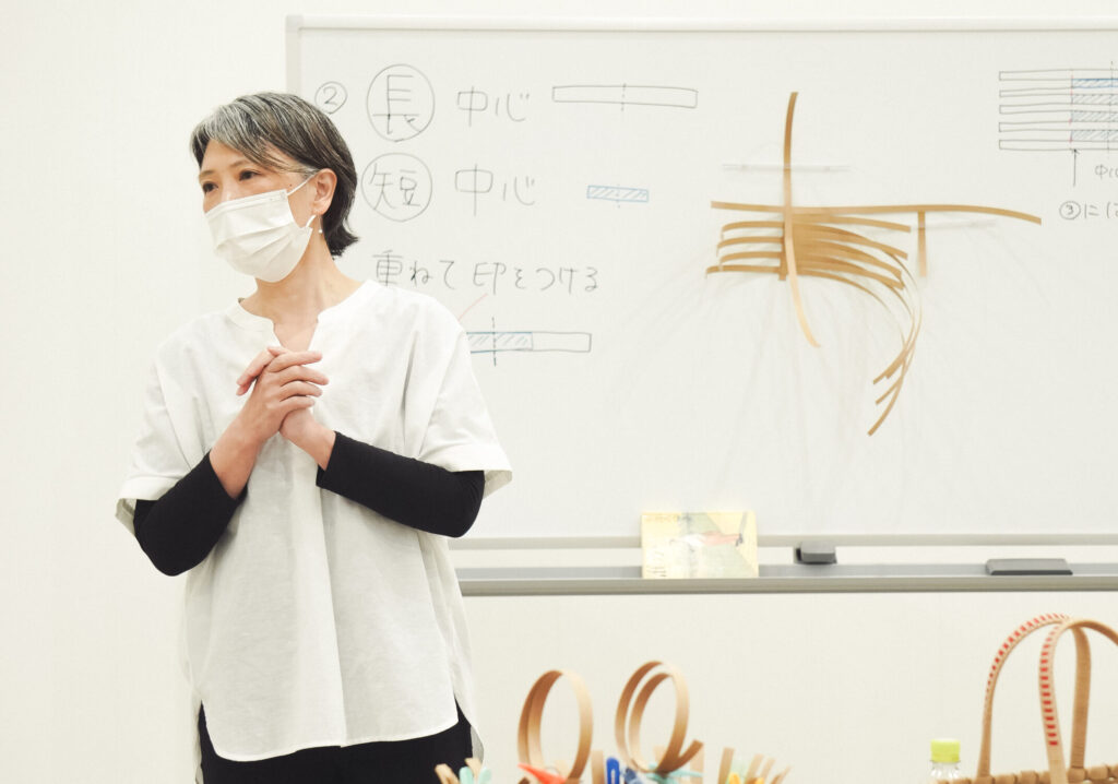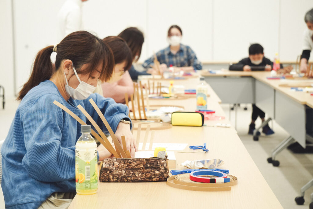「手軽に気軽に手作りを愉しむ」をモットーに活動されており、カゴ編みや消しゴムハンコなど、多彩なハンドメイド品の制作・販売を行っています。ワークショップや講座の経験も豊富で、その快活でエネルギッシュな指導で、作業に迷う参加者の背中を力強く押し、制作をリードしてくださいました。