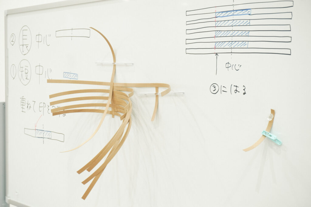 初日は、バンドを適切な長さにカットするところからスタートしました。岩本先生はホワイトボードを使い、バンドの寸法や複雑な底の作り方をイラスト入りで図示。視覚的にも理解しやすいよう工夫してくださいました。