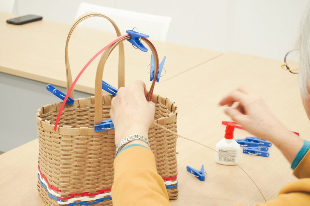 しかし、仕上げの作業は指先に力のいる工程も多く、「ちょっと疲れてきた」「手が痛い」といった声もちらほら。実際に自分で苦労して編んでみたことで、「販売されているカゴバッグのお値段の意味が、しみじみ分かりますね……」と、手仕事の価値を改めて実感されている様子でした。